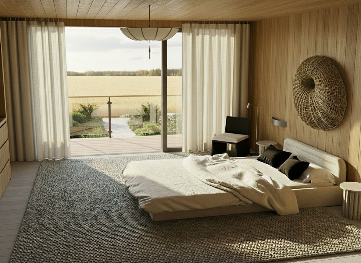 While the form pays homage to traditional agrarian structures, the execution is purely minimalist- focusing on “intentional emptiness” and the warmth of natural wood to create a space that feels both expansive and profoundly quiet. Large-scale windows are positioned to capture the shifting light of the ‘Golden Hour,’ turning the surrounding environment into a living, ever-changing piece of art.