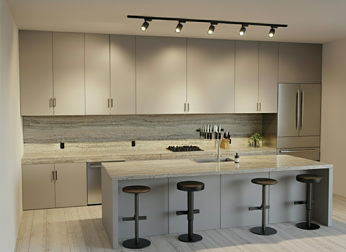 an exercise in reductive design. The kitchen is treated as a piece of stationary sculpture. The alignment of the cabinetry creates a continuous rhythm that draws the eye toward the expansive story within.